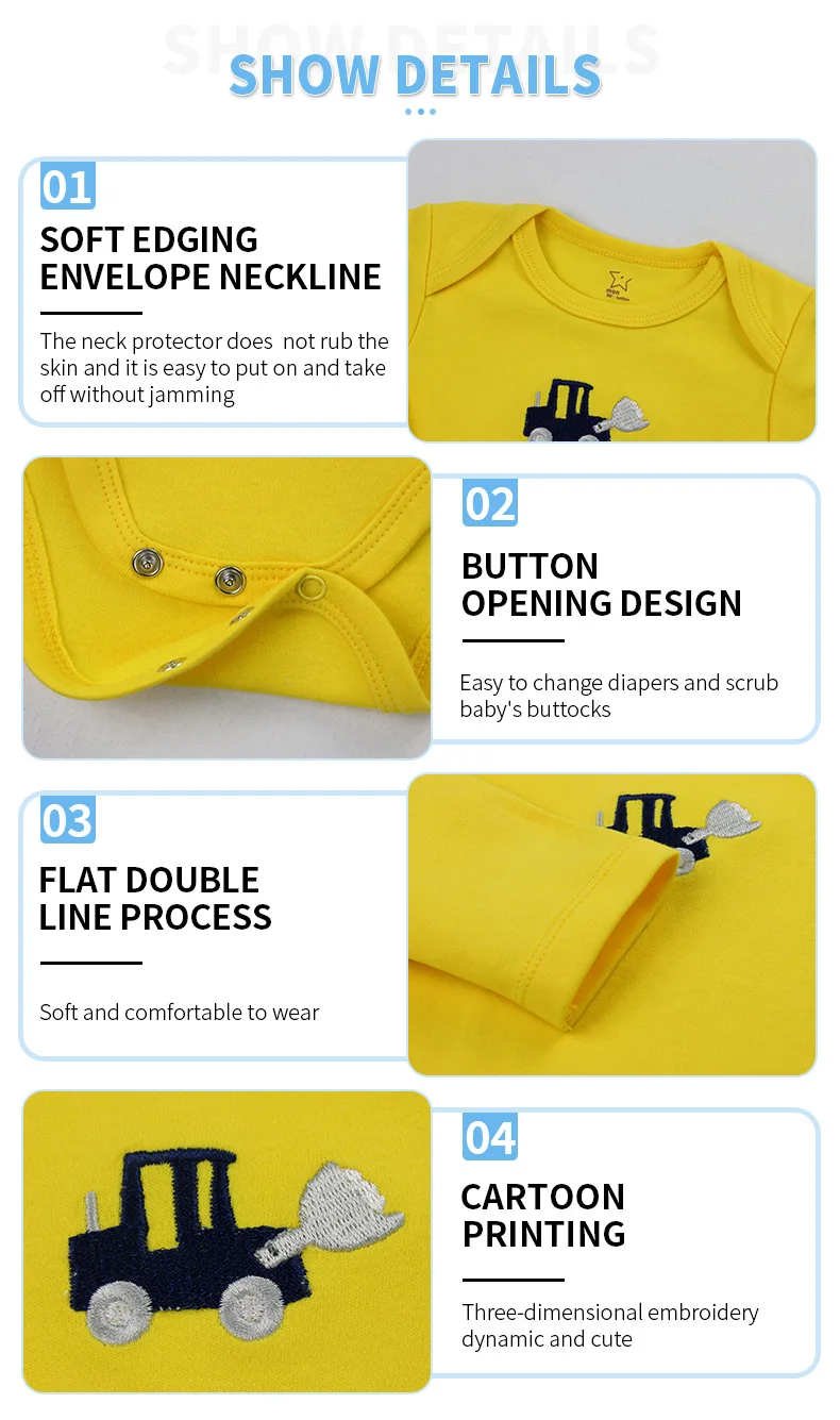 4個単位で販売されており、各バッチは配送に便利なように丁寧に梱包されています。カジュアルなスタイルをお探しの方にも、エキサイティングなアップデートをお探しの方にも、 卸売カスタマイズされた男の子用ジャンプスーツ すべて揃っています。今すぐお問い合わせいただき、ご注文をカスタマイズして、赤ちゃんに欠かせない必需品を揃えましょう。