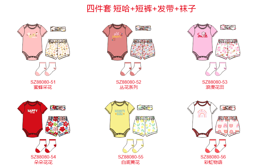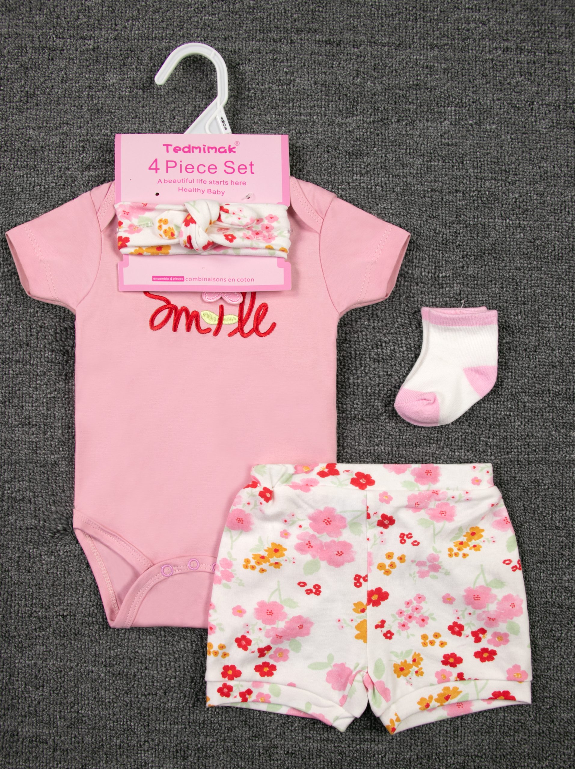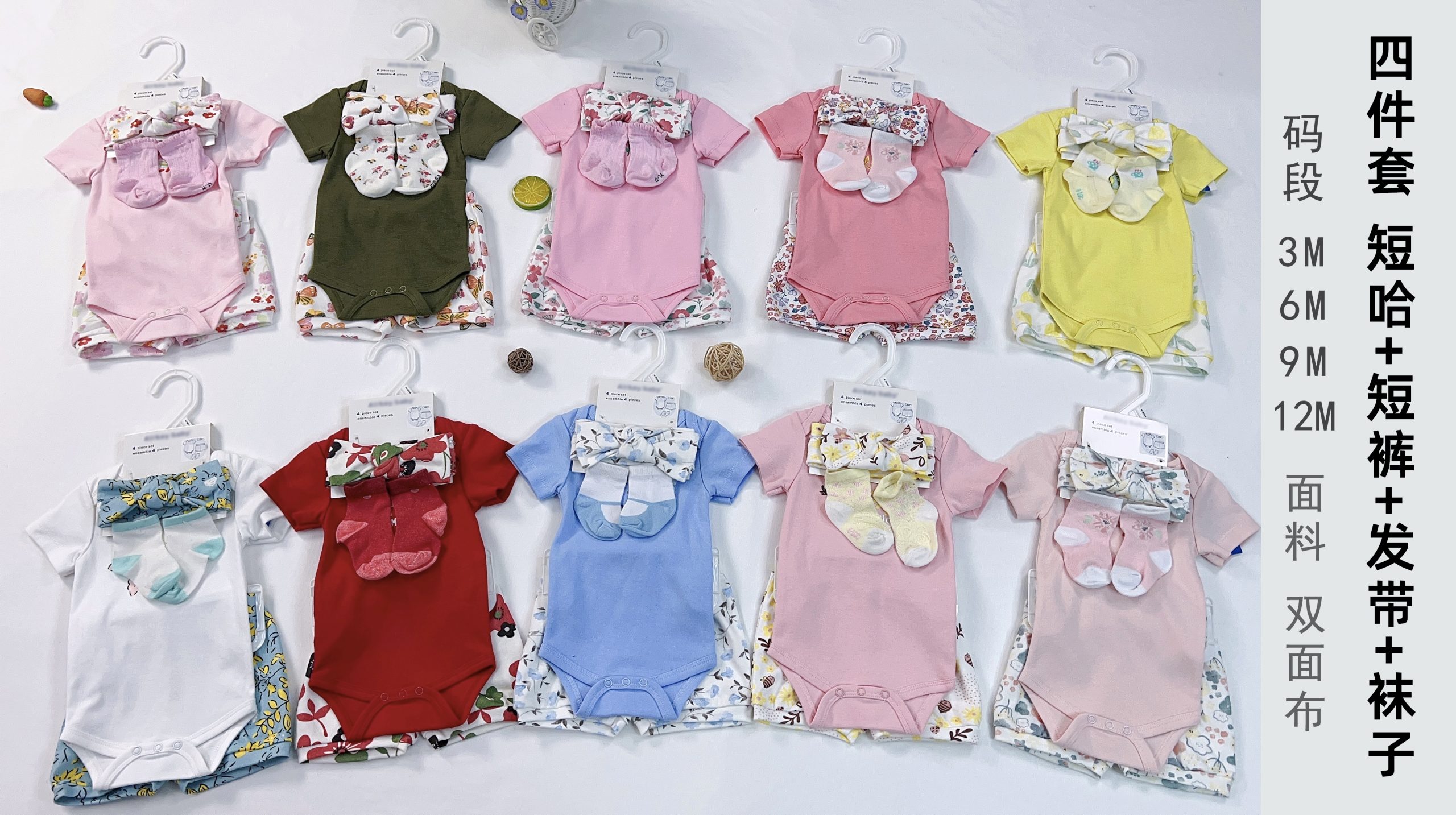| Material (Description) | Cotton baby bodysuit, shorts pants, bib, socks |