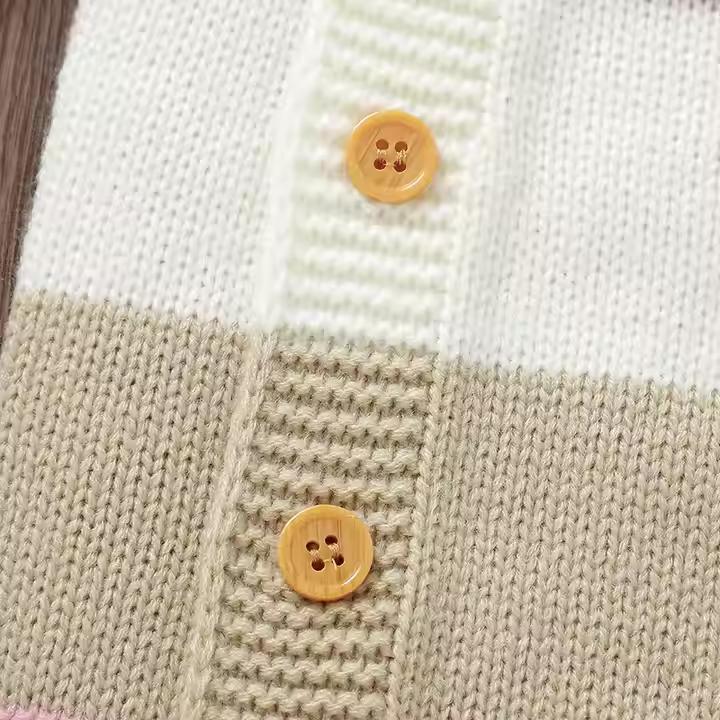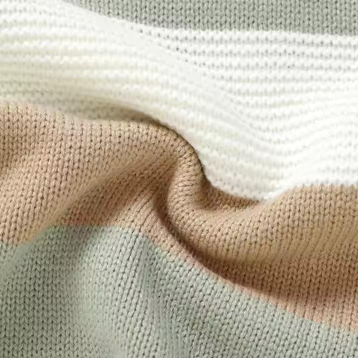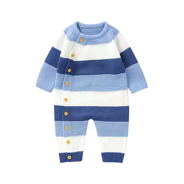 These Knitted Newborn Colorful Striped Pattern Baby Rompers are made from 100% acrylic for a soft and warm feel, perfect for winter. Featuring a fun striped design and full sleeves, they offer comfort and style. The button closure makes dressing easy. Made in Dongguan, Guangdong, with OEKO-TEX STANDARD 100 certification. Available in customizable colors and sizes. MOQ is 1 piece, with fast delivery options. Ideal for both boys and girls!